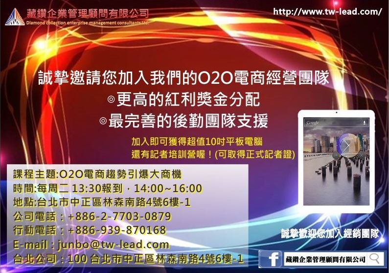 15:15~16:00 | 主題:如何從O2O電商服務,牽引大商機。 主講人: 藏鑽企業管理顧問有限公司-總經理 傅堃榕 子題:電商經營,有效創造您的收益。 |