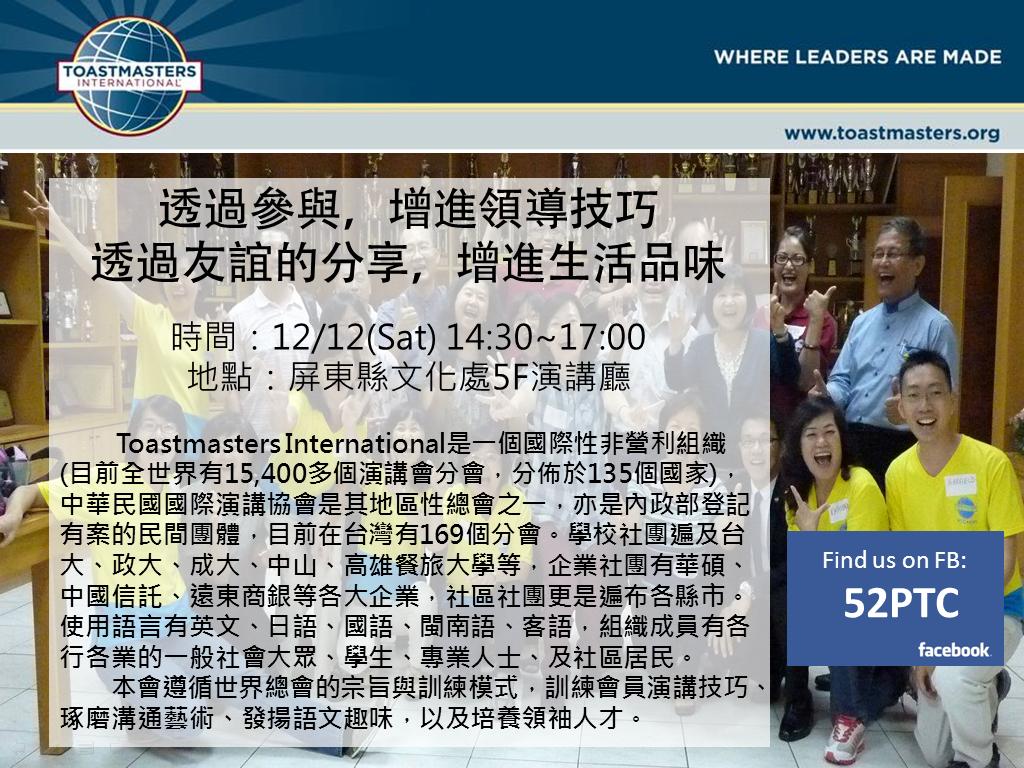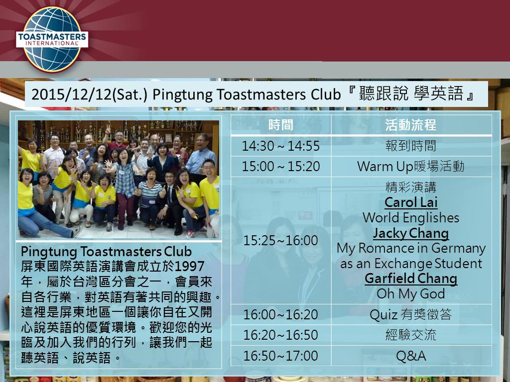12/12 屏東縣文化處5樓演講廳,三位英語演說達人將分享他們的學習經驗。