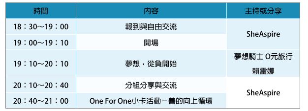 7.課程捐贈名額或物資使用狀況,將持續公告於SheAspire官網及臉書One For One社團。