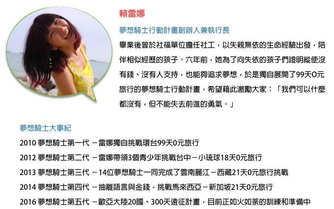 賴雷娜,一個國二就被父母拋棄的孩子,連申請低收入戶補助都沒有資格的她,只能靠自己半工半讀賺取生活費與學費,一個人生從負值出發,對自己感到自卑,看似與夢想絕緣的女孩,如今反倒透過自創的《夢想騎士行動計畫》,一次又一次帶領失親與迷惘困頓的青年朋友,在O元旅行中找到自我價值與挖掘出潛能,讓許多不敢作夢,認為自己毫無資源、才能的青年,和她一樣點燃築夢的熱情與勇氣,成為追夢的榜樣。