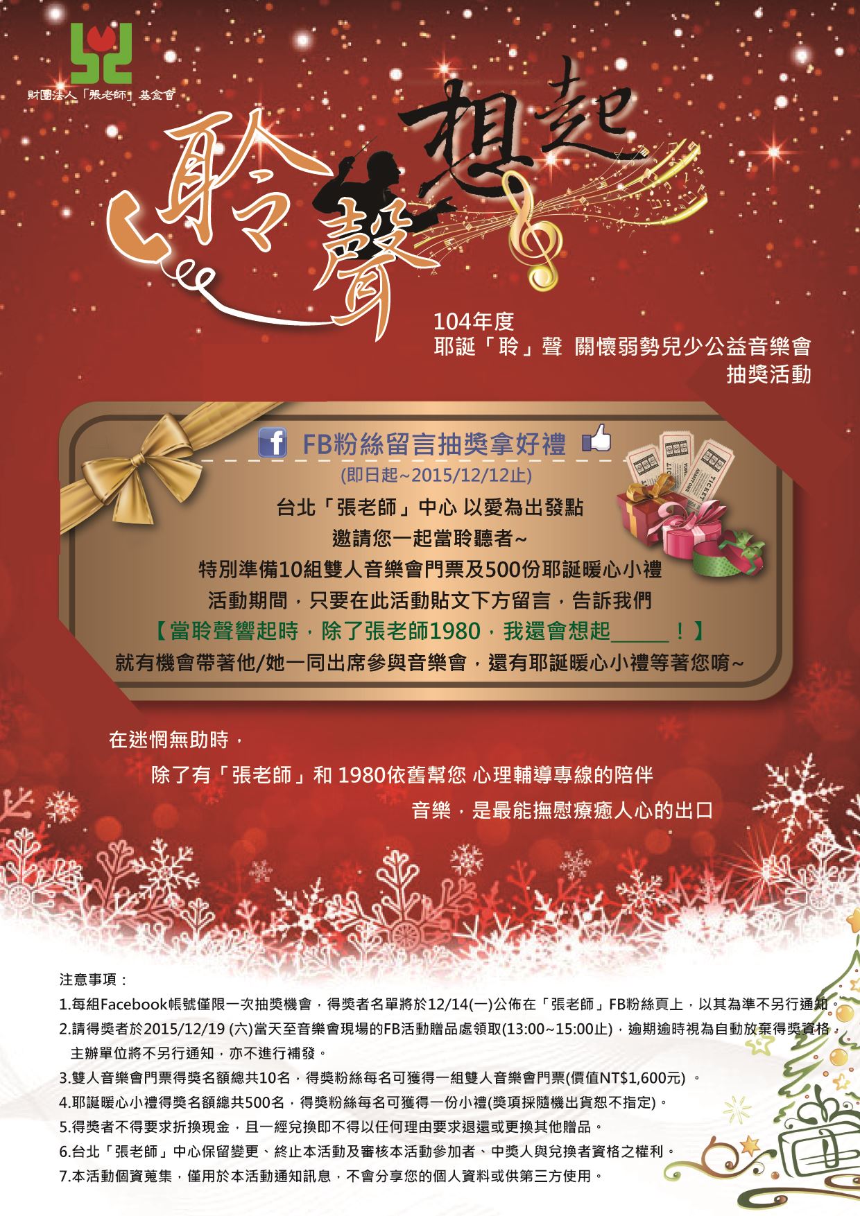 即日起~2015/12/12只要在台北「張老師」心靈加油站 FB粉絲團(按此連結)的此活動貼文下方留言,告訴我們