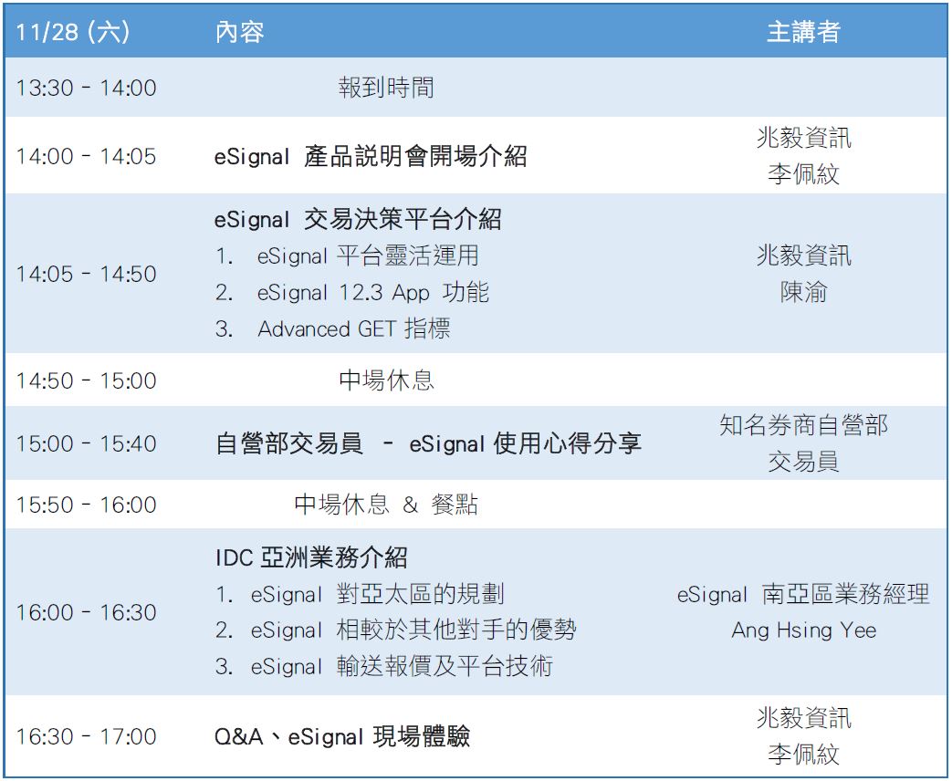 會中將介紹強大的eSignal交易決策平台特點及進階應用,我們特別邀請到eSignal南亞區業務經理