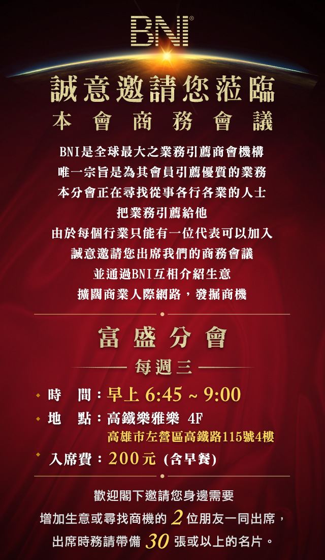 高雄BNI誠摯邀請在專業上獲得肯定並認同付出者收穫的您蒞臨商會,