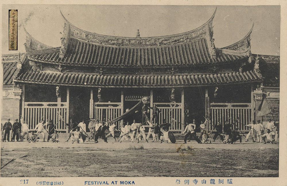 此為日本衫田書店發行的金獅團明信片,右下角誤植為艋舺龍山寺,經考察後實際上此為大龍峒保安宮。