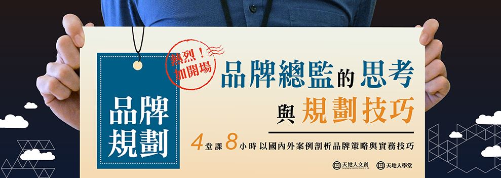 近年來「品牌」已成為國際各產業最熱門的關鍵字之一,無論代工製造、貿易商、品牌商,皆積極思考或佈局轉型創立自有品牌的可能性,思考如何運用新的工具手法,與新世代消費者接軌。天地人文創旗下天地人學堂本次開設 品牌總監的思考與規劃技巧 課程,針對不同層次的品牌規劃技巧,以進口汽車、零售通路商、國際新創企業、消費品集團等多產業面向解析,8小時提升品牌策略思考能力,增加市場競爭力!