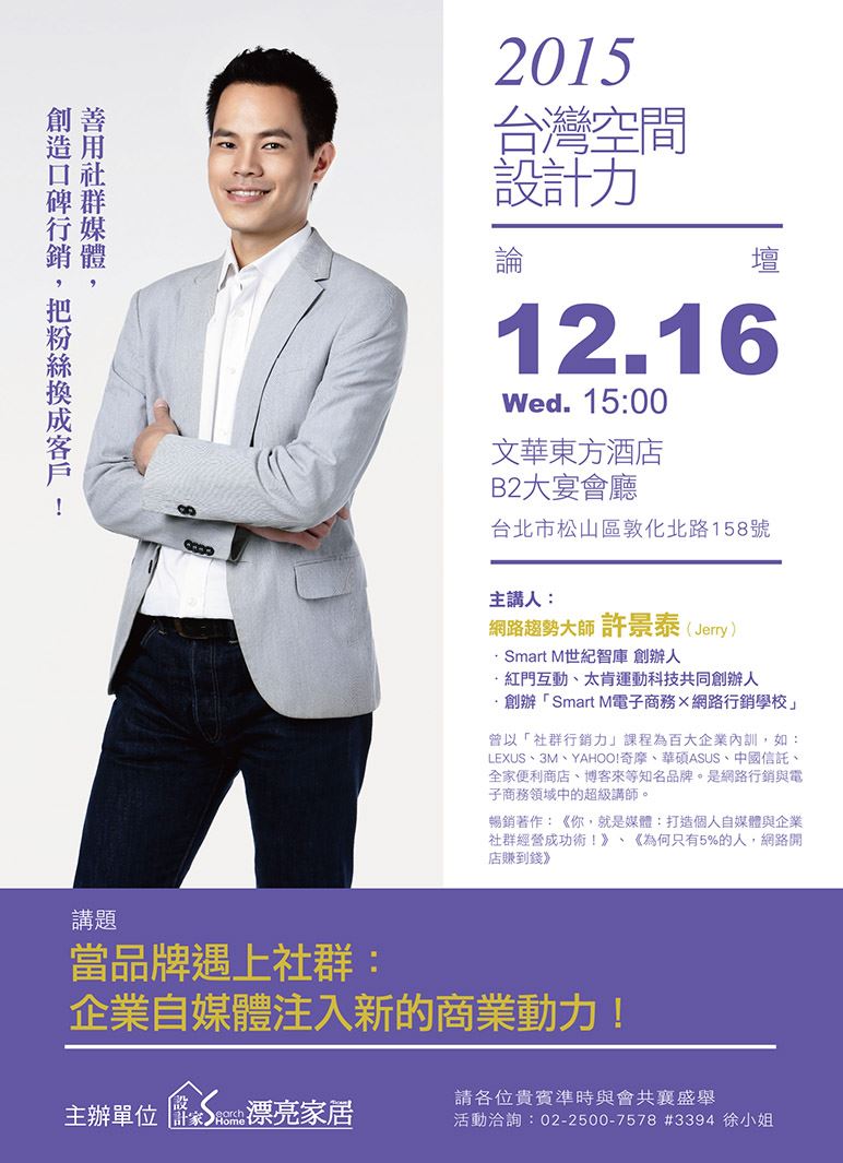 網路趨勢大師 許景泰(Jerry)曾以「社群行銷力」課程為百大企業內訓,如:3M、YAHOO!奇摩、中國信託、博客來等知名品牌。是網路行銷與電子商務領域中的超級講師。