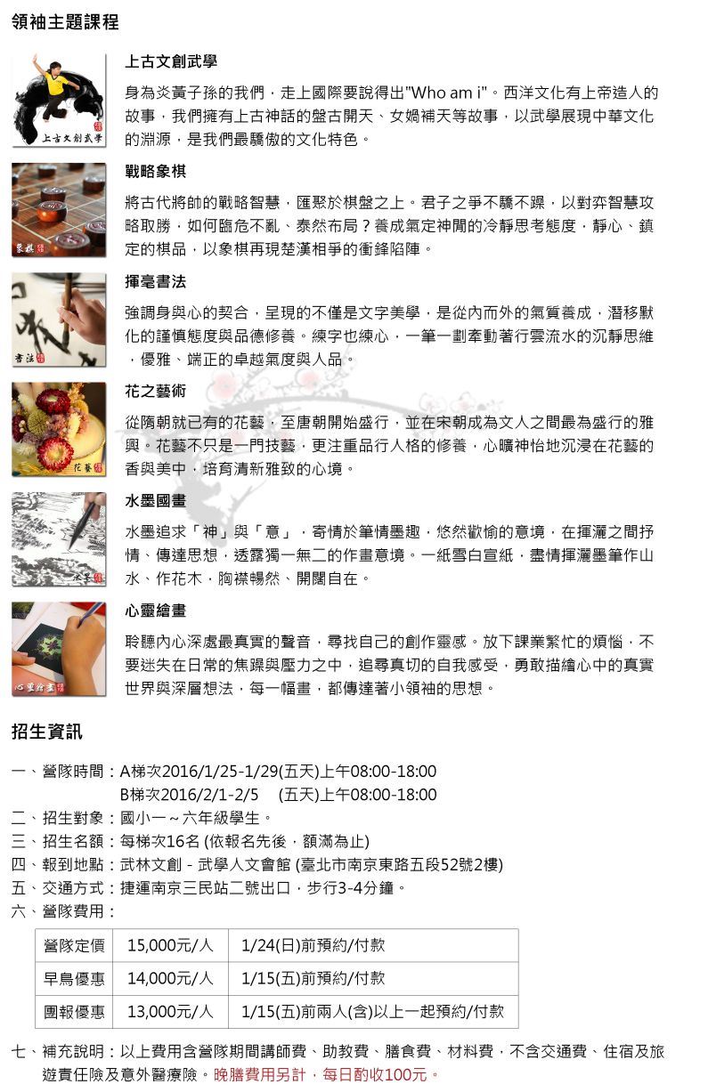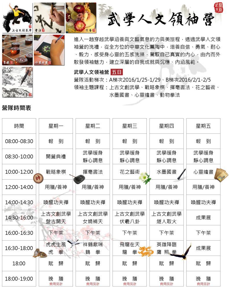 一、營隊時間:A梯次2016/1/25-1/29 (五天)上午08:00-18:00、B梯次2016/2/1-2/5 (五天)上午08:00-18:00
