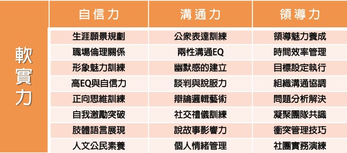 我們將課程架構分為「軟實力」及「硬實力」,以六大能力為核心,延伸出48個內容單元。
