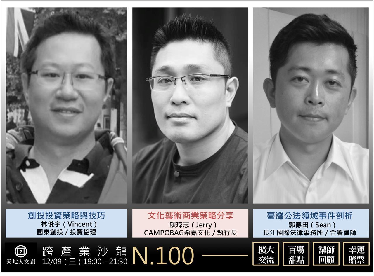 Vincent專精於IPO / SPO、企業併購M&A及風險投資VC, 網羅符合公司投資策略的團隊,投資並協助企業成長。天地人文創邀請Vincent將於N.100跨產業沙龍分享:(1)台灣、大陸、美國的創投思維有何不同(2)台灣VC / PE概況與投資屬性(3)尋找投資企業流程及盡職調查Due-Diligence之內容(4)如何拿到創投的資金與找尋來源、相關投資合約之內容與注意事項?精彩N.100天地人文創跨產業沙龍內容,於12 / 9 (三)邀請您一同瞭解!
