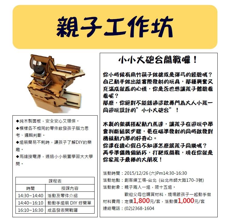 材料費用:定價1,800元/套,活動價1,000元/套(歡迎父母也購買材料,現場跟孩子一起動手做)