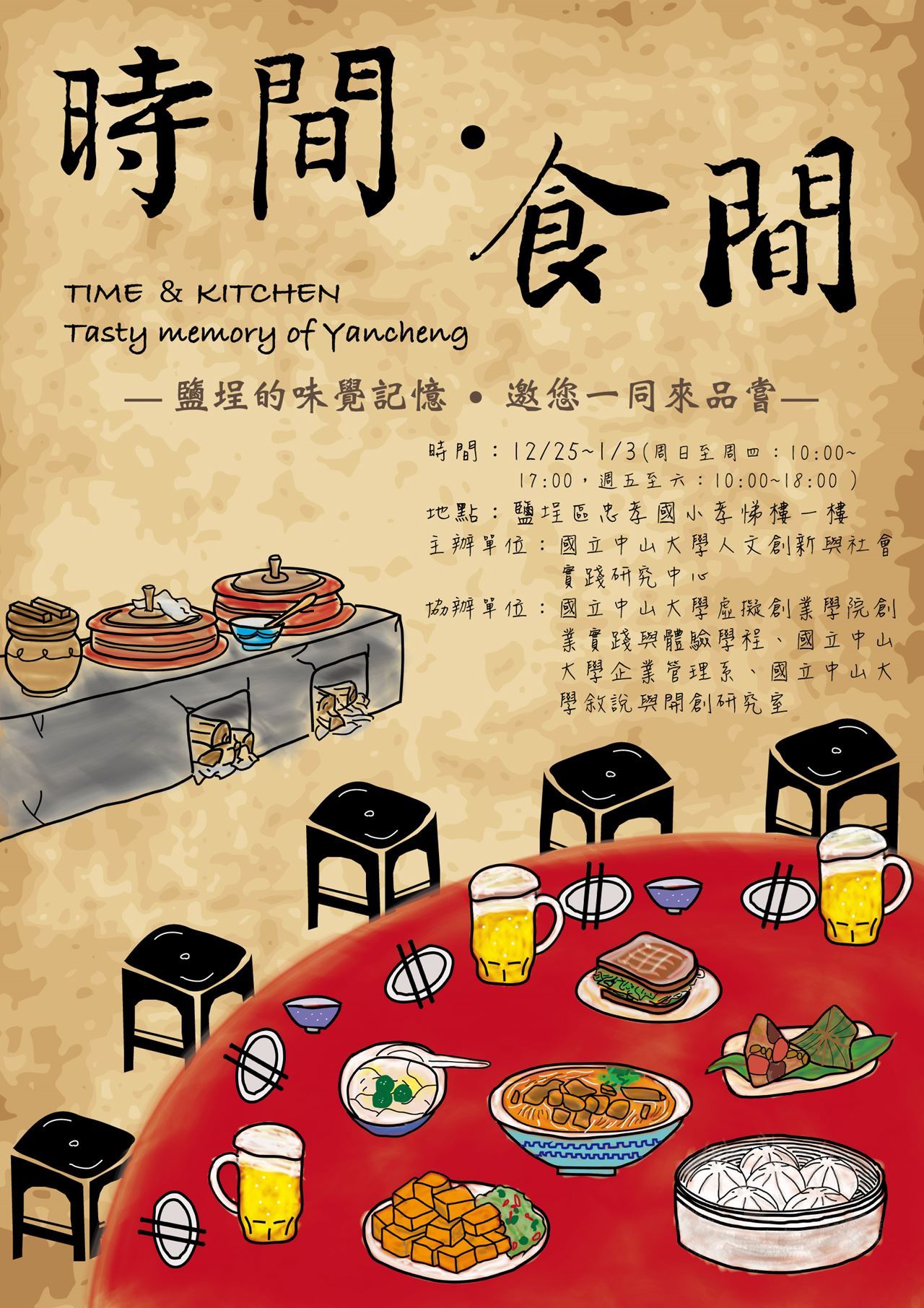 由中山大學人文創新與社會實踐研究中心主辦,我們以時間為軸,食間為線,串起鹽埕的前世今生,構思了這次的時間.食間鹽埕特展,結合歷史脈絡及地方文化,讓生活在鹽埕裡發生的故事與不可或缺的美食做結合,推廣鹽埕在地特色與保存曾有過的美好。