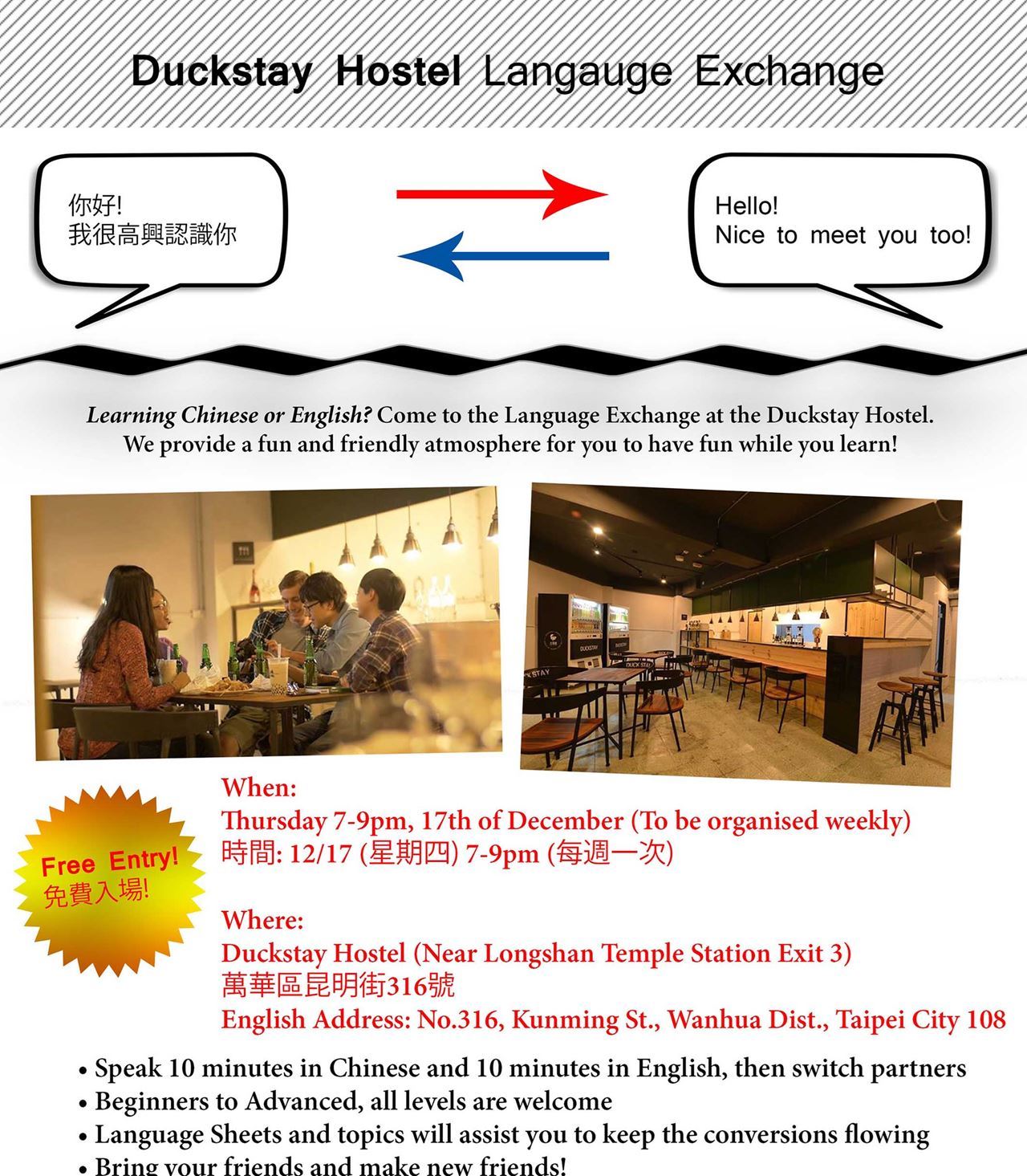Learning Chinese or English? Come to the Language Exchange at the Duckstay Hostel.