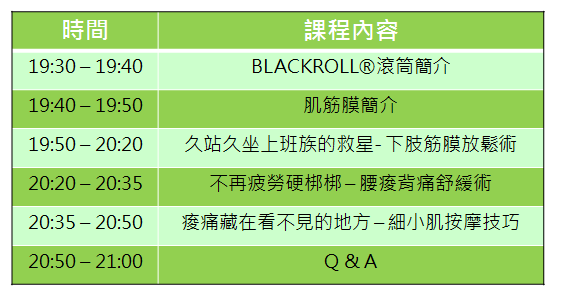 ※本課程全程提供 BLACKROLL 試用,若您自備其他產品可於現場諮詢是否適合課程動作。