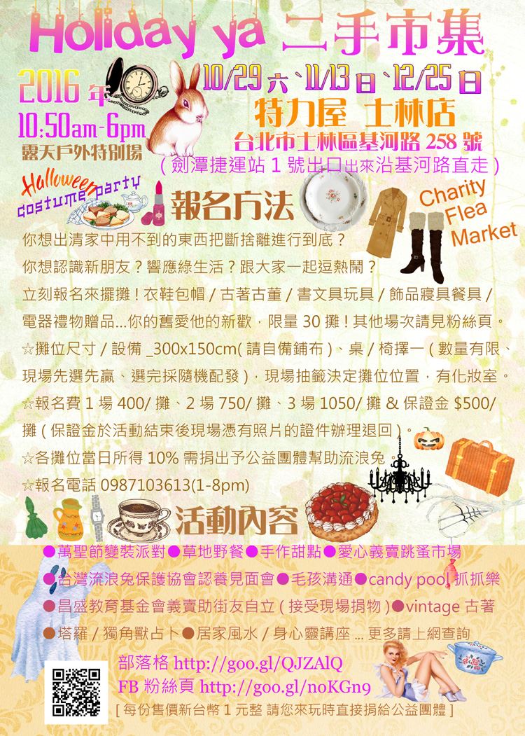Holiday ya二手市集2016戶外特別場活動時間10月29日(六)/11月13日(日)/12月25日(日)...,上午10點50分至傍晚6點在特力屋士林店(台北市士林區基河路258號)舉行。更多活動訊息請上粉絲頁查詢 https://www.facebook.com/holidayy2013
