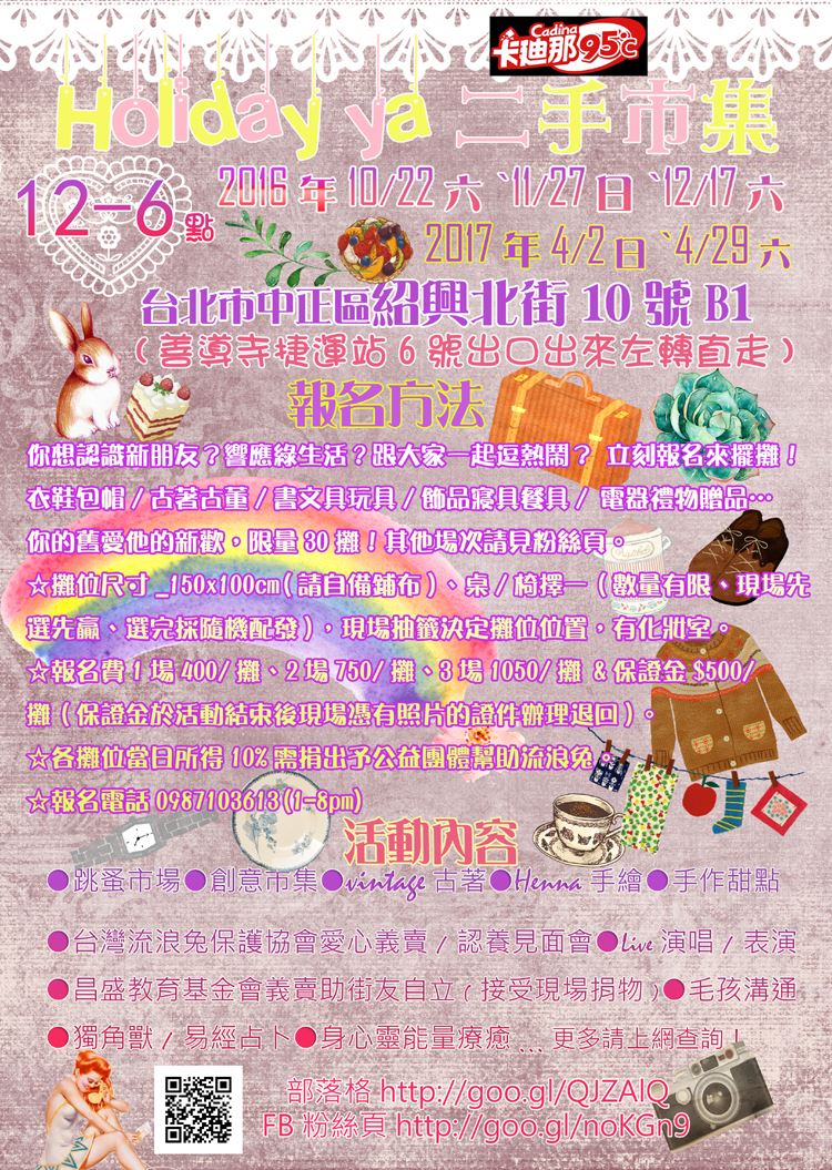 Holiday ya二手市集鄰近交通便利的善導寺捷運站,在冷氣開放的室內空間中您可以帶著毛小孩愜意地在眾多跳蚤市場攤位中慢慢探索尋寶,欣賞Live演唱同時逛逛令人激情四射的各攤超值好物挖寶,與攤主聊聊認識新朋友,逛累時來點文青用心製作的手作甜點,還可以體驗手做diy與不定期企劃的各式講座工作坊(ex.藝術癒療/冥想接收天使訊息..),另外創意無限的藝術創作者手創作品,各種身心靈牌卡塔羅占卜/henna彩繪不容錯過,還能親手撫摸待認養的可愛癒療兔寶貝…參與攤位都將捐出當日10%收益幫助流浪兔,一起為毛小孩盡一份心力。
