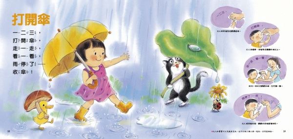 《親子遊戲動動兒歌-打開傘》是專門為0~3歲寶寶設計的兒歌集,詞短易記,內容生活化,念起來充滿了節奏和韻律感。最特別的是, 活動當天請到了信誼基金出版社總編輯廖瑞文小姐來為爸爸媽媽導讀書籍。