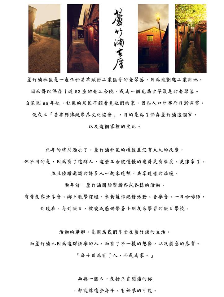 ‧活動地點:蘆竹湳‧古厝風情館 (苗栗縣頭份市蘆竹里15鄰191號)