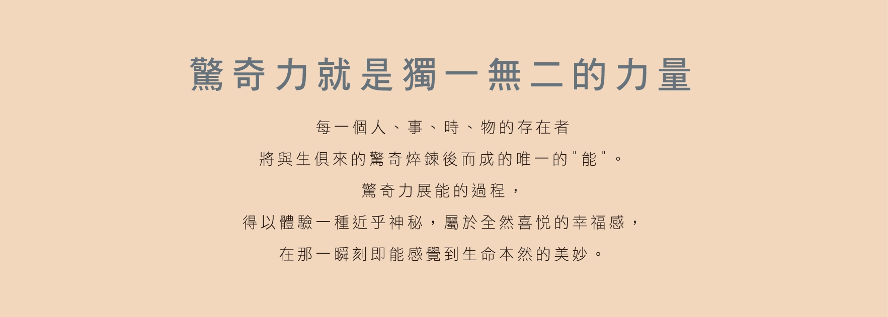 | 驚奇力就是每一個生來獨一無二的人、事、物、時在焠鍊後而成的唯一的"能"。驚奇力展能的過程,得以體驗一種近乎神秘,屬於全然喜悅的幸福感,在那一瞬刻即能感覺到生命本然的美妙。 |