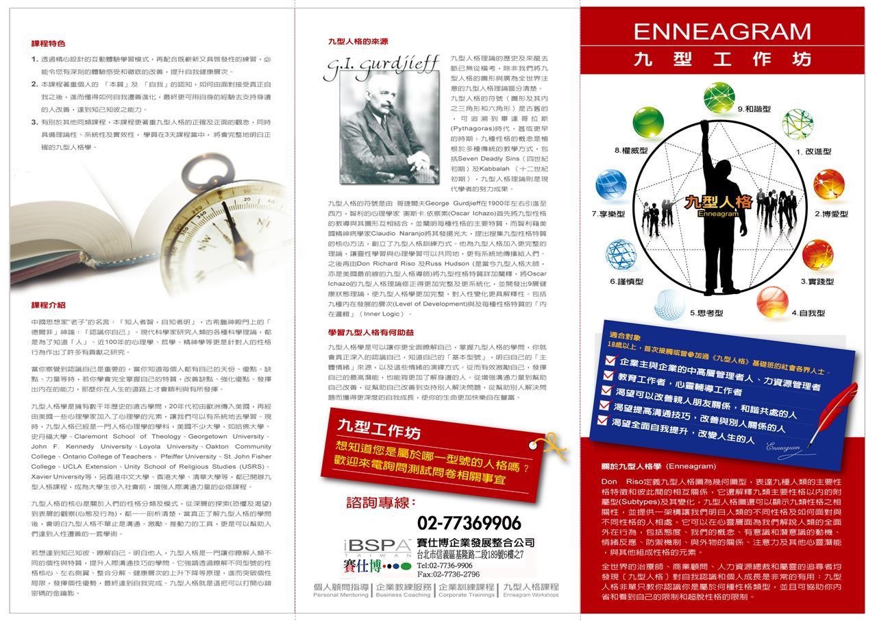九型人格 Enneagram近年來用在許多企業與學校裡面,作為溝通,激勵,與推動力的一套工具. 對於個人成長與企業管理有很好的幫助.