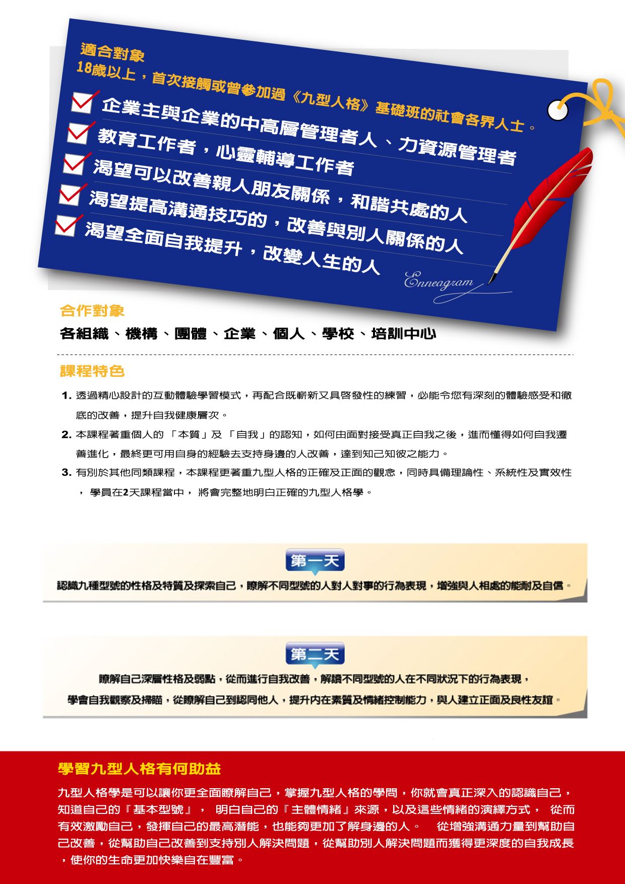 與不同類型的機構合作提供培訓課程給個人及企業, 特別是九型人格課, 可以幫助人加強溝通能力, 發揮同理心, 增強企業效益, 支持個人成長