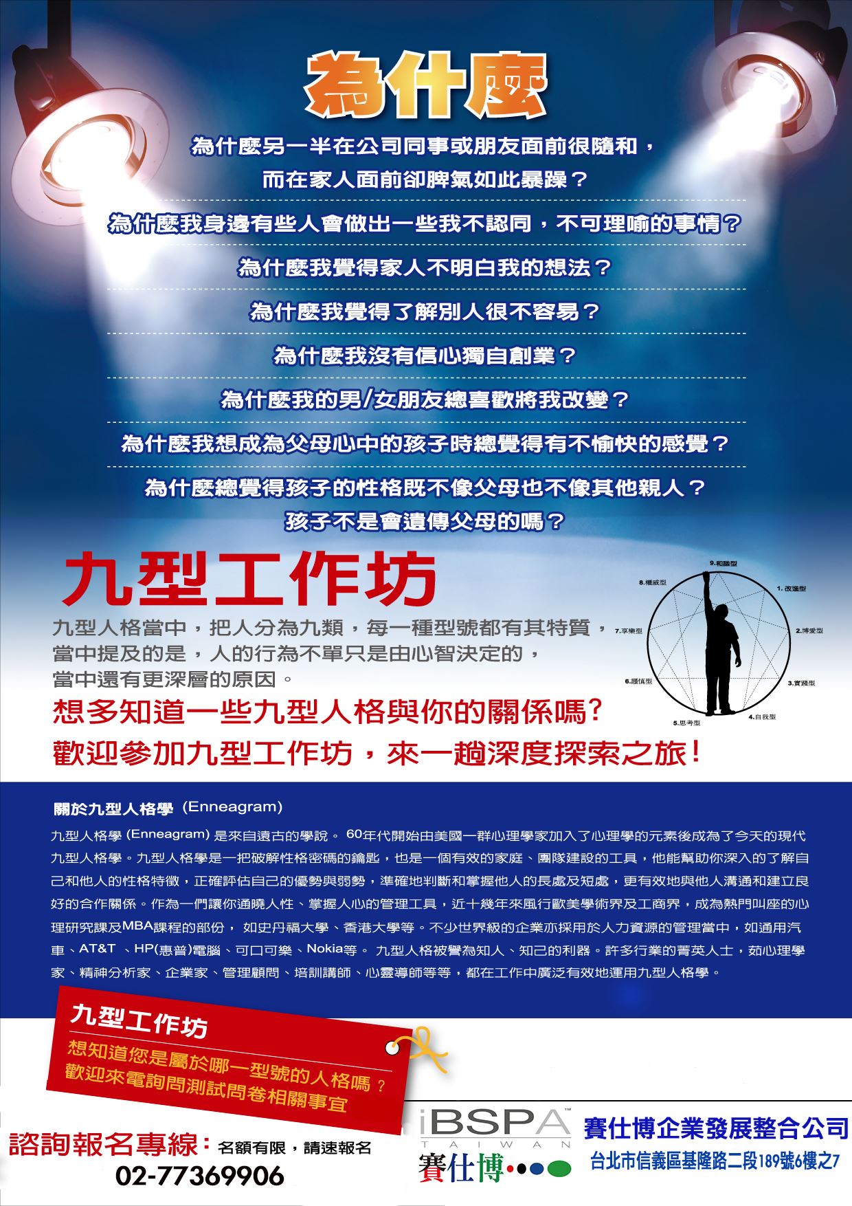 測驗網址 : IBSPA 九型人格測驗 (上課前需要完成這項測驗能讓老師幫助您更了解自己喔)