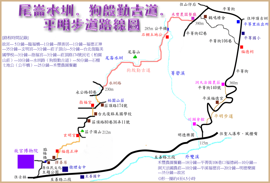 故宮東側廁所,取左循農路上行→臨福橋→「擇善居」古厝→叉路,路口內住家是至善路341巷27號,取左上登,離開農路→小土地公廟→十字叉路,橫向是嶺腳水管路,取直續上登→「玄明宮」,石梯路結束→叉路,路口有棵巨樹,取右延木板圍牆旁上行→叉路,左線是莊頂路80巷,今取直沿台北復臨美國學校旁續行→「指福宮」,接莊頂路,右轉續行→「柏園山莊」莊頂路174巷對面水泥小陸續行→左側水圳→永公路40巷→接金合興圳(狗殷勤古道)→公平橋→木造涼亭→花崗岩石街陡上→平菁街42巷→禾豐農園餐廳