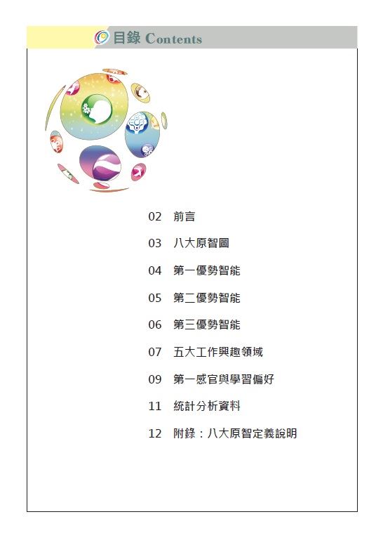 哈佛大學教授迦納博士所提出的多元智能,結合每個人先天的7個參數,成為八大智能的實用版「八大原智」,透過八種智能的強弱分析與物極必反的現象,讓每個人的特質有量化的標準。