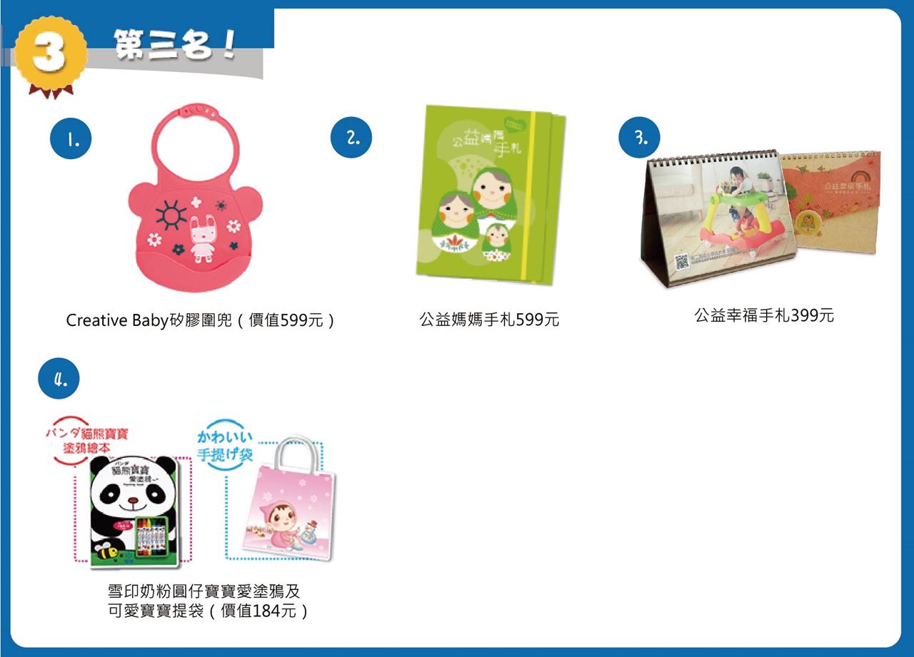 第三名:Creative Baby矽膠圍兜(價值599元)+寰宇家庭米奇妙妙屋(價值699元)+公益媽媽手札(價值599元)+育兒生活雜誌3期(價值597元)+公益幸福手札(價值399元)雪印奶粉圓仔寶寶愛塗鴉及可愛寶寶提袋(價值184元)總價值:3,077元