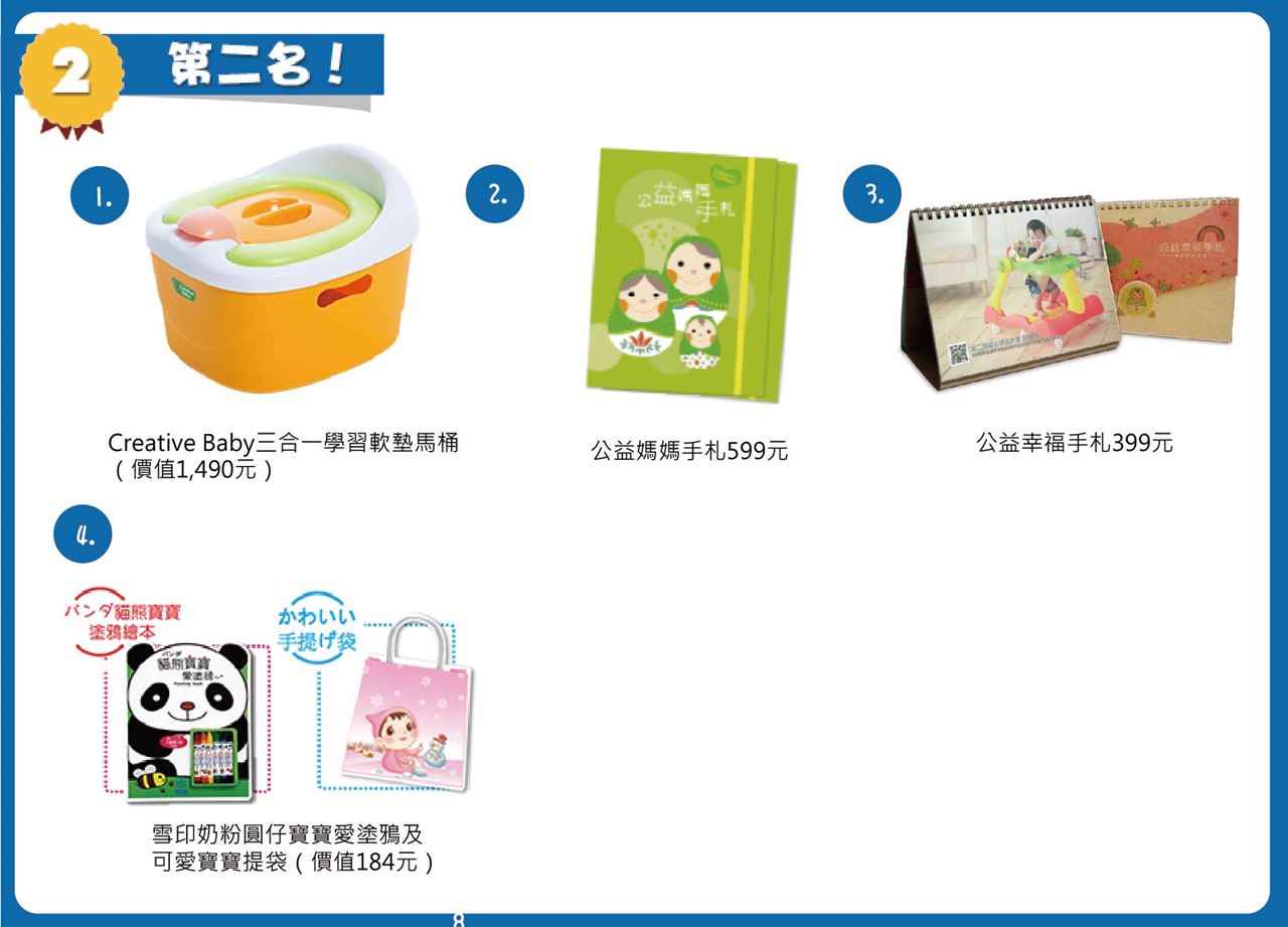 第二名:Creative baby三合一學習馬桶軟墊(價值1,490元)+寰宇家庭溫林月光寶盒(價值899元)+公益媽媽手札(價值599元)+育兒生活雜誌3個月(價值597元)+公益幸福手札(價值399元)+雪印奶粉圓仔寶寶愛塗鴉及可愛寶寶提袋(價值184元= 總價值:4,168元