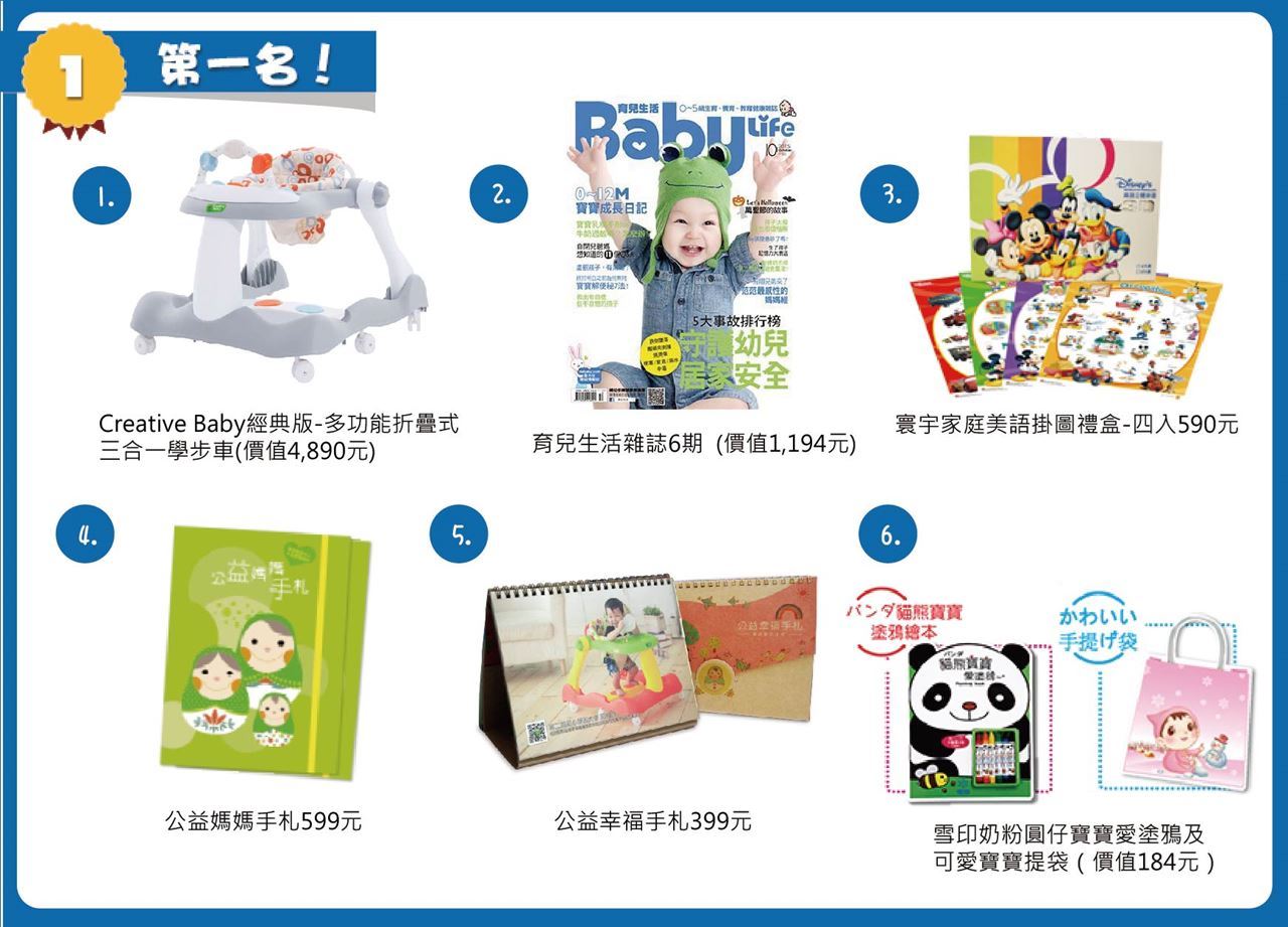 第一名:經典版-多功能音樂折疊式三合一學步車/助步車(價值4,490元) +寰宇家庭彌月禮盒(價值1,288元)+育兒生活(價值1,194元)+公益媽媽手札(價值599元)+公益幸福手札(價值399元)+雪印奶粉圓仔寶寶愛塗鴉及可愛寶寶提袋(價值184元)= 總價值:8,154元