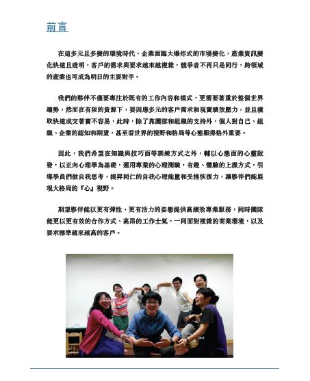 世界大格局菁英的心理樣貌 | ‧ 世界菁英的外貌 ‧ 潛在的心理樣貌 ‧ 快速的受挫恢復力 ‧ 工作的價值與意義 | ‧ 講演 ‧ 測驗 ‧ 分組活動 ‧ 影帶欣賞 ‧ 體驗活動 |