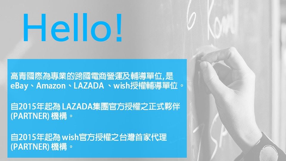 LAZADA集團官方授權之正式夥伴 (PARTNER) 機構,代理所有台灣廠商的LAZADA (印尼、馬來西亞、菲律賓 、新加坡、泰國及越南) 開店、培訓、平台管理、API對接、媒體、政府公關推展。