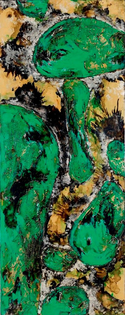 | 汪天亮 凝碧積錦 200x80 cm 漆、綜合媒材 2014 | 汪天亮 綠光 高45 cm 脫胎漆器 2002 |