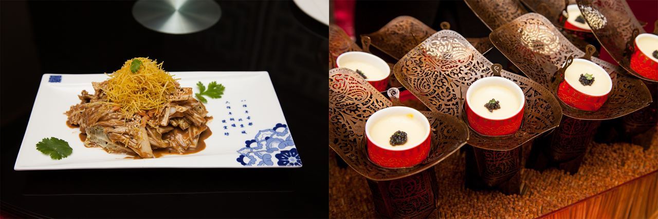 (右)風雲晉爵水芙蓉用的仿古代爵杯的酒杯裝著滑嫩的蒸蛋,上頭再加上魚子醬、杯底還有鴨肉末,箇中鮮味要嘗過才知道