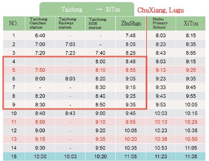 Traffic: Take bus "Taichung=>Xitou" from Taichung Ganchen station, Taichung Railway station or Taichung HSR station. Alight at "Chuxiang Staion"(初鄉).The bus duration is about 1hr10min