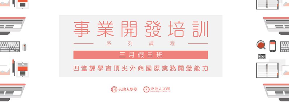 所謂 事業開發 ,指的是 Business Development,簡稱BD。近年國內外優秀廠商在求才上都有BD職務需求,為了能讓企業開發新的目標市場及建立更具有價值的商業模式機制,在廣大的國際市場裡,能擁有創造、整合其他業務、行銷、產品、服務等相關能力成為廠商企業優先挑選的指標之一。而事業開發主要實際工作內容參考如下:1. 市場瞭解 2. 策略擬定 3. 夥伴結盟 4. 通路拓展 5. 業務開發天地人文創旗下天地人學堂本次開設 事業開發 Business Development課程,為各位參加的朋友培養國際級職場技能,增加市場洞察力,協助開創新事業!