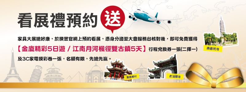 家具大展搶好康,於揆眾官網上預約看展,憑身分證至大會服務台核對後,即可免費獲得【金廈精彩5日遊 / 江南月河楓徑雙古鎮5天】行程兌換券一張(二擇一)及3C家電摸彩卷一張,名額有限,先搶先贏。