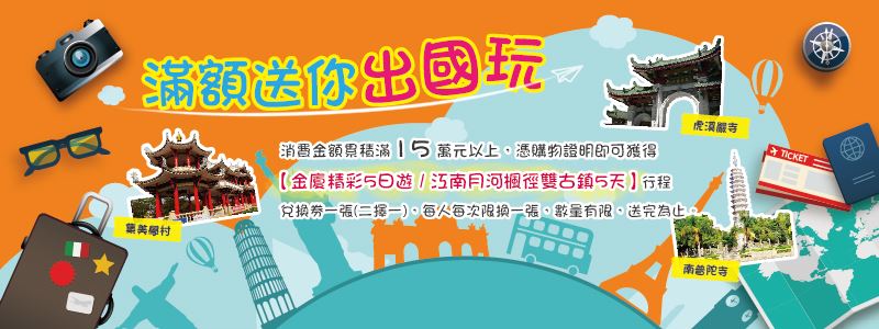 消費金額累積滿15萬元以上,憑購物證明即可獲得【金廈精彩5日遊 / 江南月河楓徑雙古鎮5天】行程兌換券一張(二擇一),每人每次限換一張,數量有限,送完為止。