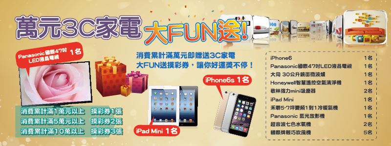 消費累計滿萬元即贈送3C 家電大FUN送摸彩券,讓你好運獎不停!
