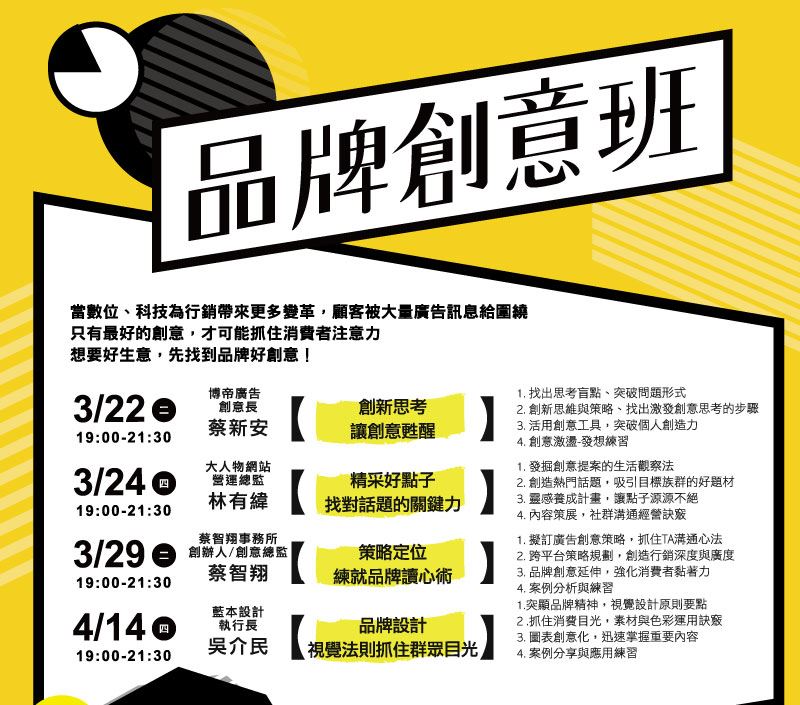 【課程異動提醒】 原定4/16(六)/ 4/23(六)【 廣告大師創意講堂:BBDO黃禾廣告 營運董事 何清輝】