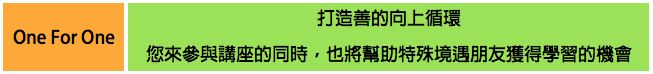 若您參與以上四個系列活動,我們就會捐贈一個學習名額,投入以下特境族群教育運用,也將持續開展其他圓夢教育及職力培訓課程。
