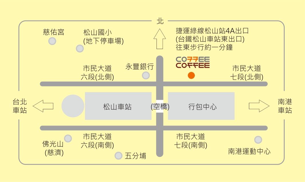 捷運松山站4A出口 -> 松山火車站東出口 -> 步行約一分鐘;