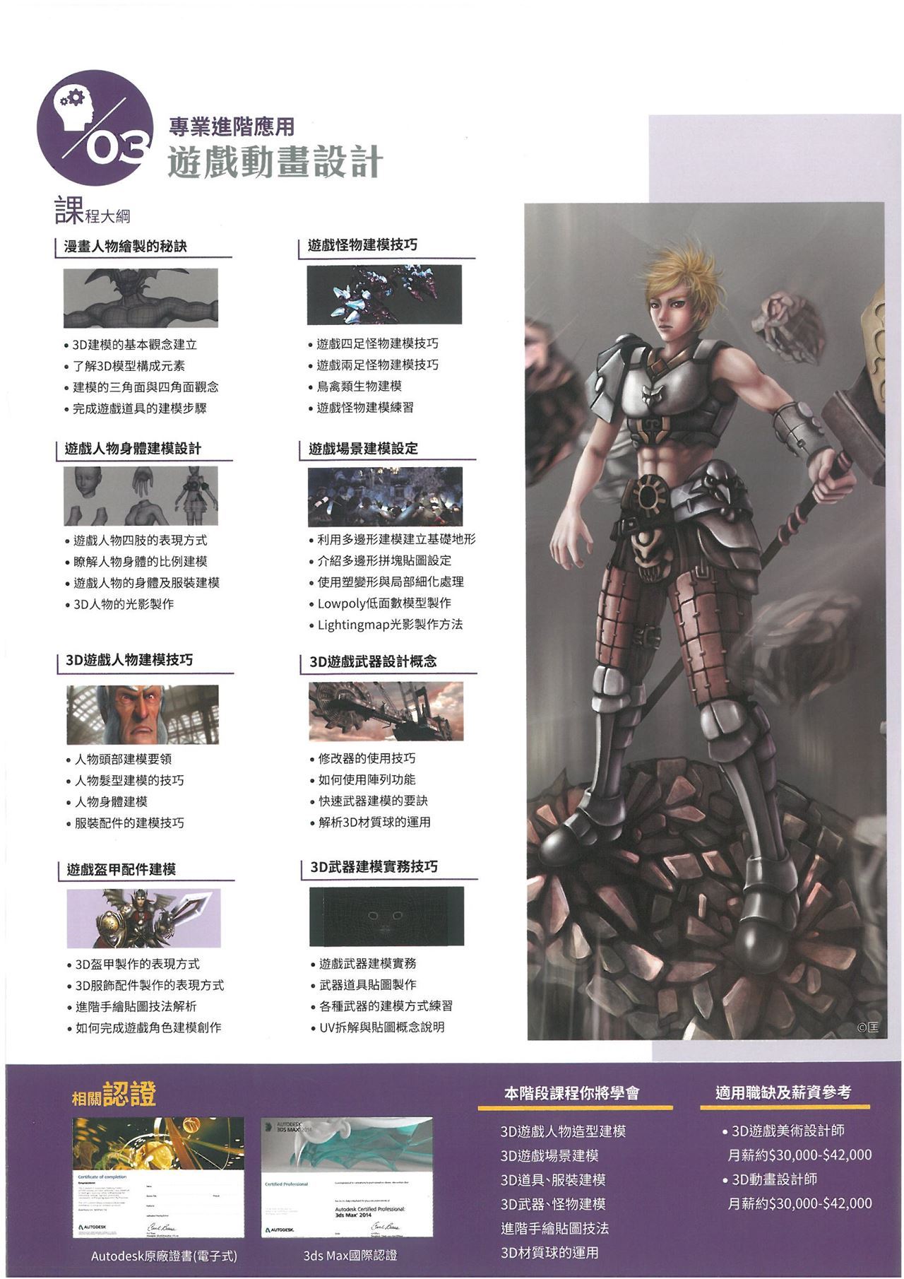 一款遊戲如何吸引玩家的注意,感官上的第一印象,通常決定該款遊戲的受關注度,對於遊戲畫面而言,絢麗的場景生動的角色,都是打動玩家的利器,遊戲美術設計師,是遊戲角色、場景的締造者,可以說是整個遊戲產業發展過程中,有著不可替代的地位,遊戲美術設計專業課程,正是針對以上需求而設立的,聯成電腦訪談多家遊戲大廠,針對企業人才需求設計,故課程的人才培養目標就是為遊戲公司培訓出合格的2D、3D遊戲美術設計師,讓企業與人才無縫對接。