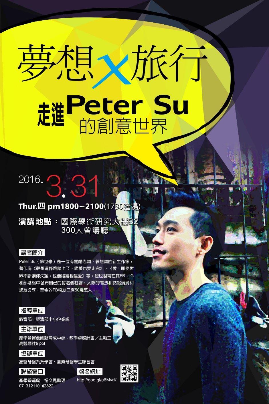 講者簡介:Peter Su(蘇世豪)是一位有關勵志類、夢想類的新生作家,著作有《夢想這條路踏上了,跪著也要走完》、愛:即使世界不斷讓你失望,也要繼續相信愛》等,他也很常在其FB、IG和部落格中發布自己的對這個社會、人際的看法和點點滴滴和網友分享,至今的FB粉絲已有50幾萬人。 時間:3/31 (四) 1800~2100(1730進場) 地點:國際學術研究大樓B2 300人會議廳 報名網址:http://goo.gl/u6MvrK 指導單位:教育部、經濟部中小企業處主辦單位:產學營運處創新育成中心、教學卓越計畫-主軸三聯絡窗口:產學營運處 楊文鳳助理#2822