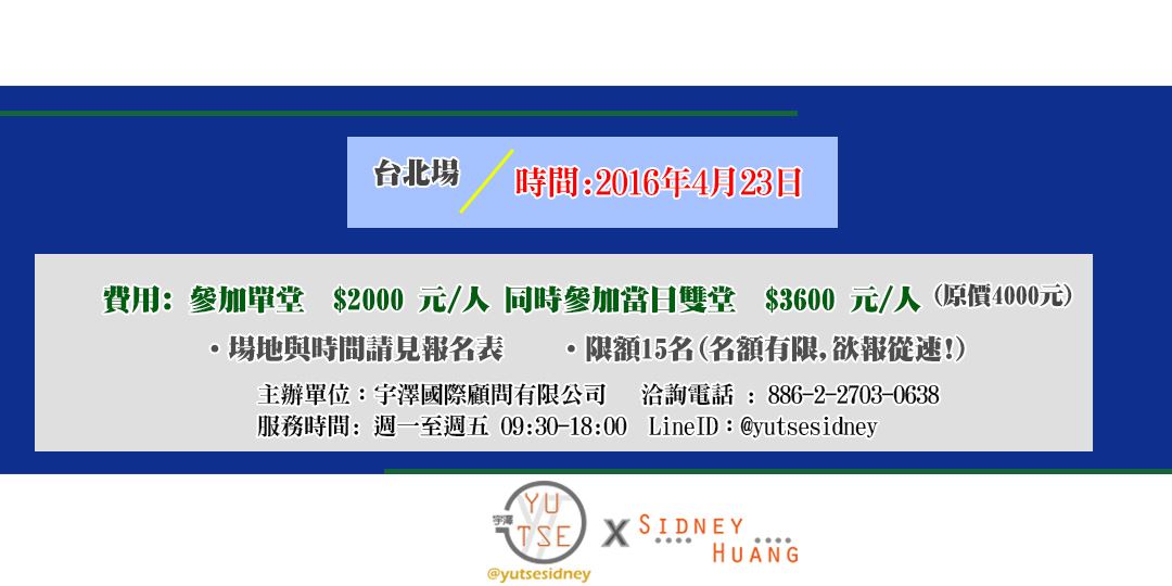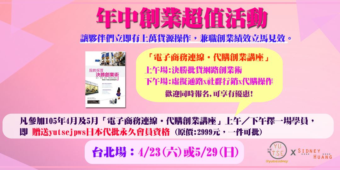 如還沒讀過服飾市場達人 sidney huang 老師的 暢銷書 "服飾採購 決勝創業術" 無免驚,趕快來參加採買決勝創業講座,教您實務操作不再紙上談兵絕對讓您功力倍增!!