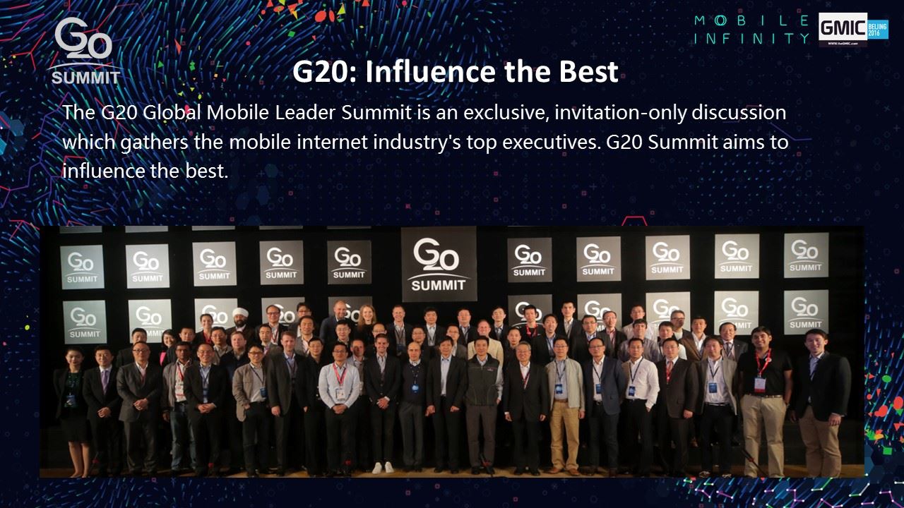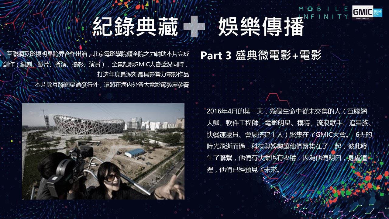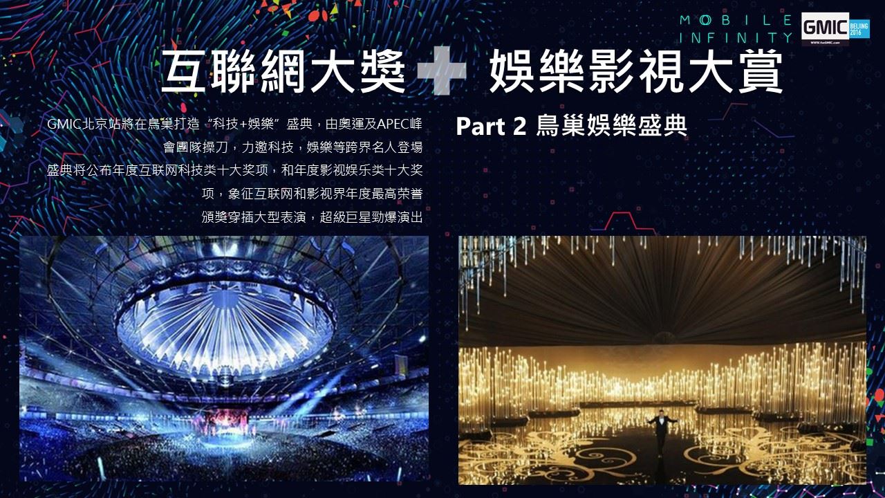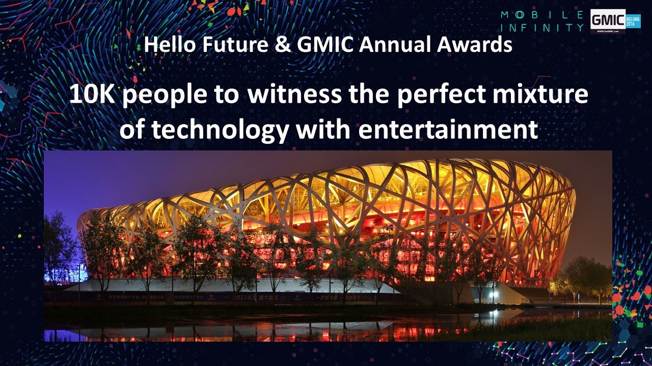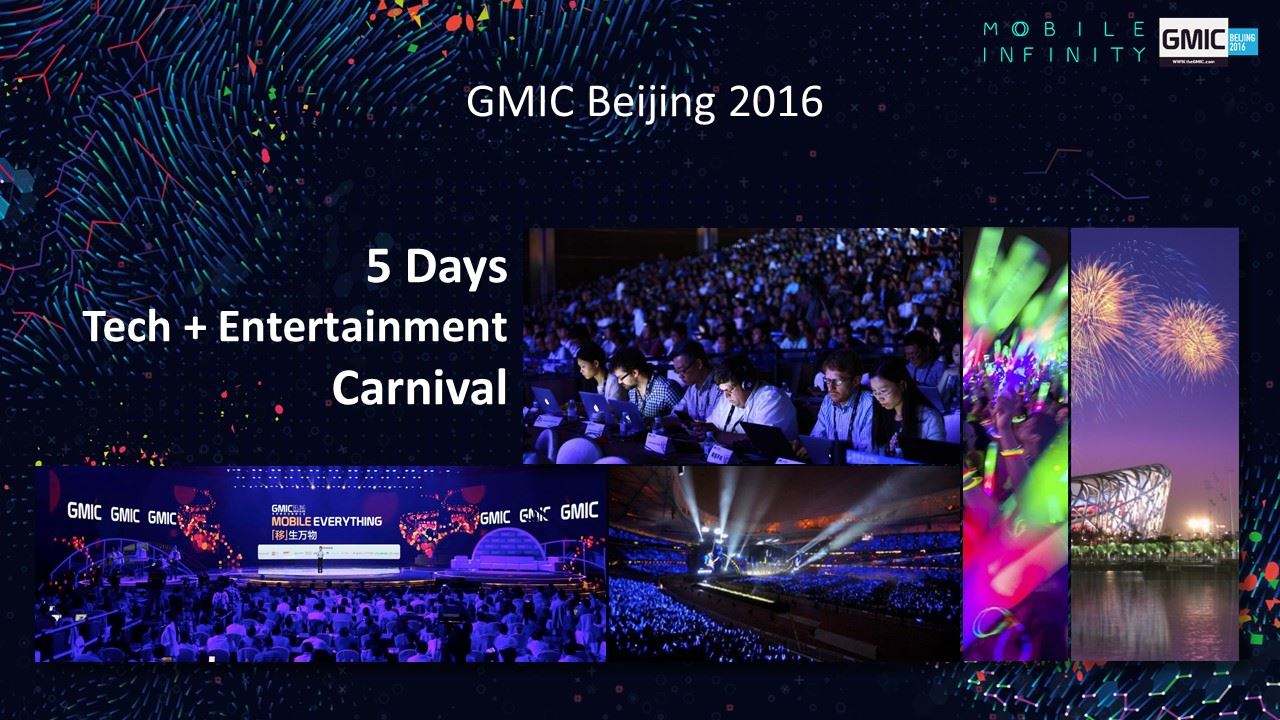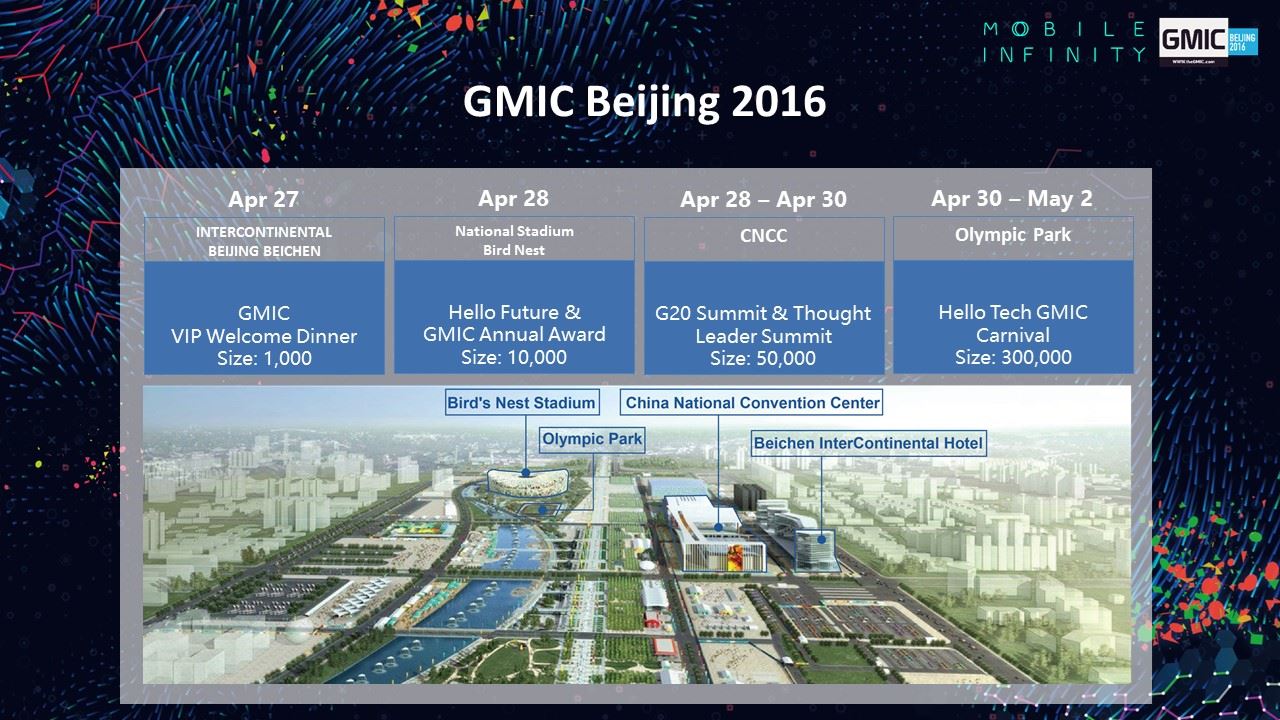 2016年,GMIC即將開啟全球九站之旅。GMIC北京站的振幅也將從國家會議中心,進一步擴大到鳥巢、奧林匹克公園及水立方等地,並首次加入泛娛樂、新人文主義的概念,這將是一場科技創新+生活方式的奧林匹克盛會。在以科技創新為核心的移動互聯時代,GMIC北京2016邀您與世界同頻共振!