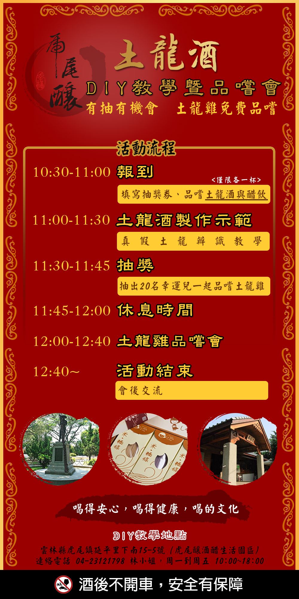 A.M10:30 ~ A.M11:00 - 報到 (填寫抽獎券.品嚐土龍酒與醋飲各一杯)