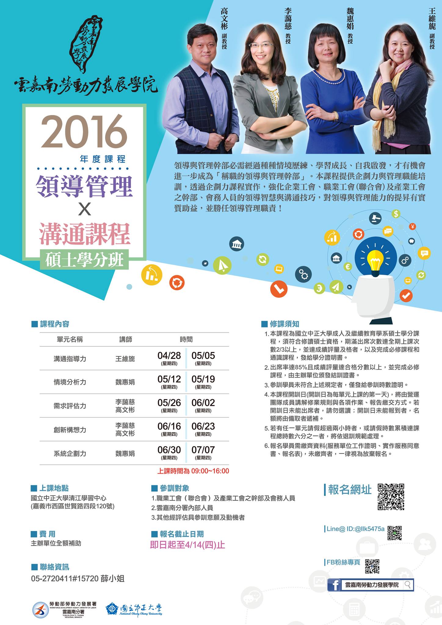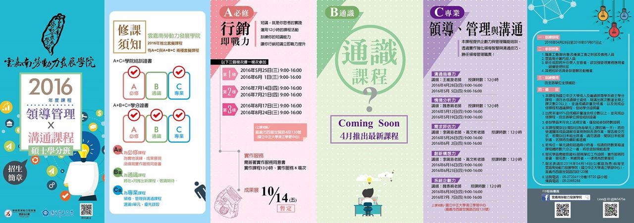 領導與管理幹部必須經過種種情境歷練、學習成長、自我啟發,才有機會進一步成為「稱職的領導與管理幹部」。今年「雲嘉南勞動力發展學院」將辦理「領導、管理與溝通課程」,邀請到領導管理和溝通指導的專家-魏惠娟老師、李藹慈老師、王維旎老師及高文彬老師,透過企劃力課程實作,對領導與管理能力的提升有實質助益,強化領導智慧與溝通技巧,讓您勝任領導管理職責!