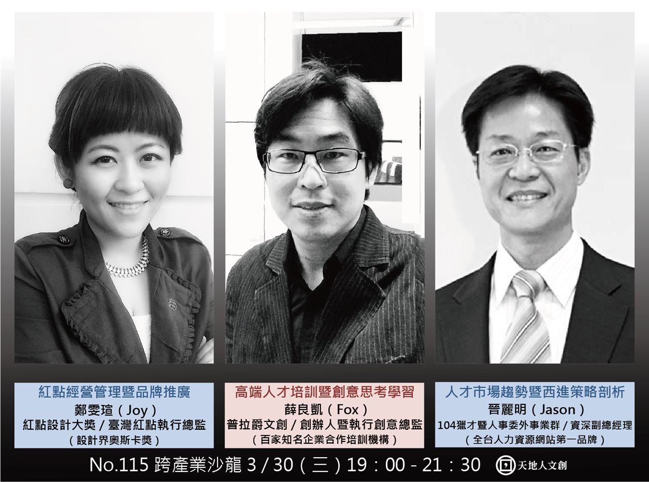 Jason工作資歷涵蓋傳產、科技及服務產業,曾任股票上市櫃公司人資主管、總經理特別助理、各企業顧問公司培訓講師,包含:經濟部、國家文官訓練所、外貿協會、工研院、中華航空、美商惠氏等,目前身兼東吳大學會計學系兼任講師,並著有《培養你的職場超能力》、《兩岸工作大地圖》等書。N.115天地人空間邀請104獵才暨人事委外事業群資深副總經理晉麗明(Jason)分享: