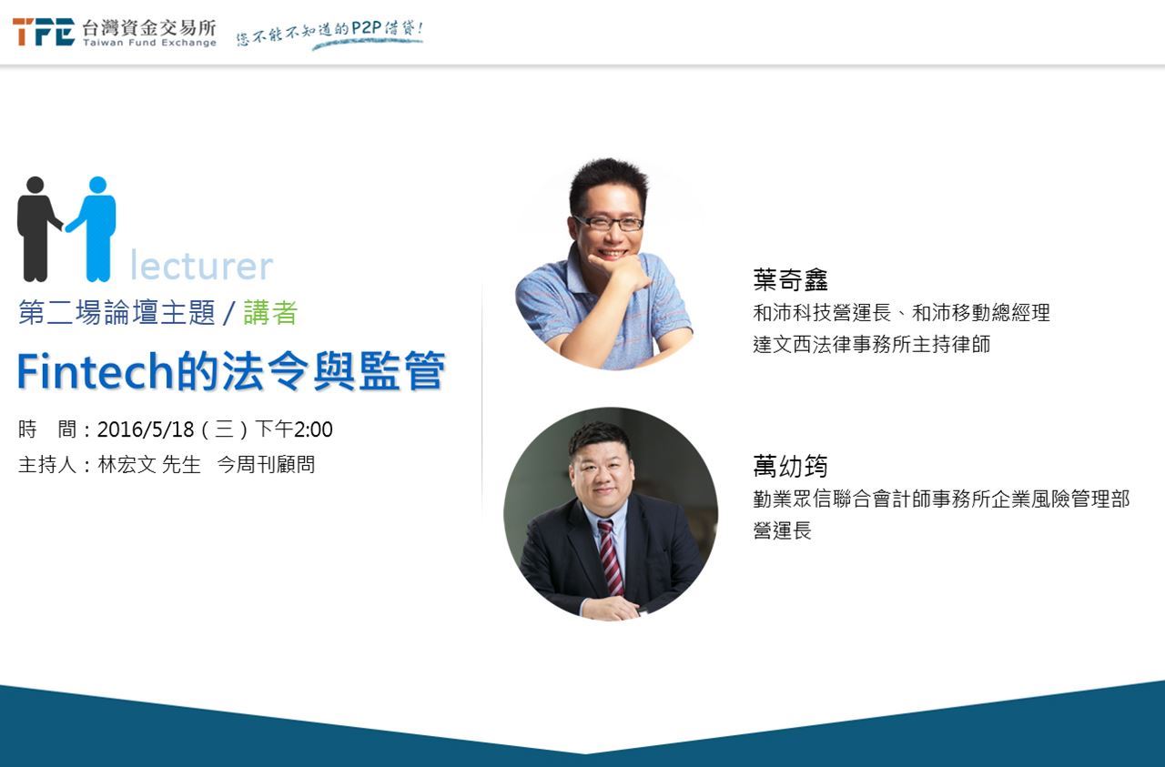 FinTech的浪潮來襲了,預估在年底前即有五、六家P2P借貸的業者要上線,政府相關的金融監理單位如何因應?先行or 先管?如何參考歐美、中國先發展後監理的先行經驗?FinTech行業又如何自我監理?、、、業者及民眾一連串的問題,有待釐清。為此,我們特別邀請對這方面嫻熟的兩位法律專家:葉奇鑫及萬幼筠先生為我們回答解惑。